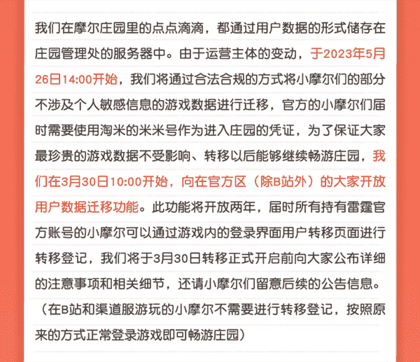 合作结束本就是开发方和代理方双方的事情,,,,降低这件事情对玩家的影响,,,才是对所有珍视这段童年的摩尔玩家最好的呵护。。目前看来,,,,用户完全不用担心后续因无法登录游戏而造成任何数据上的损失,,,只要及时进行账号转移,,就可以好好保留、、延续在庄园的痕迹和回忆,,,继续在庄园里做快乐的红鼻子小鼹鼠。。。