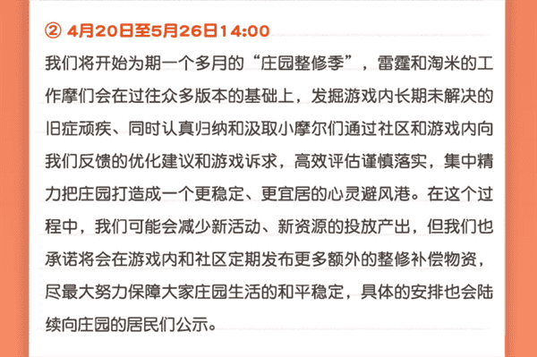 合作的结束并不意味着这个童年IP的结束,,,对于《摩尔庄园》手游而言,,,这是一个新阶段的开始。。后续游戏内将开启庄园重构计划,,会就以往遗留下来的BUG进行集中修复,,,并在游戏内和社区定期发布更多补偿物资。。。