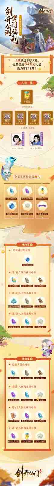 游戏为大家准备了海量的福利,,,,包括上线即可获得的全渠道预约礼包、、、、十连抽等福利,,,输入密令“JK666”、、、、“JK888”即可领取紫色弟子,,,达到金丹期后还有功法宝箱可领,,,助力全宗上下实力提升……所有奖励总价值超过648元,,,,而邀请好友一起体验,,,,更可以获得额外的奖励哦~