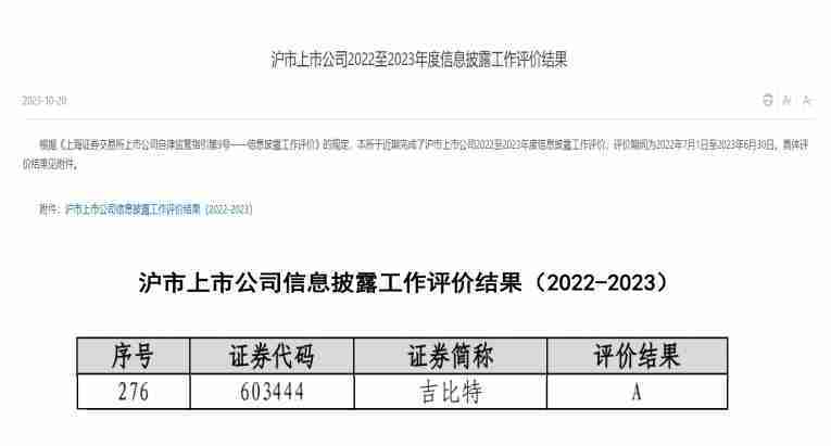 近日,,,,上海证券交易所(以下简称“上交所”)发布2022-2023年度信息披露工作评价结果。。一竞技(股票代码::603444)凭借规范的公司治理、、、高质量的信息披露以及良好的投资者关系管理再次荣获信息披露工作A级评价,,公司连续两年获此殊荣。。。