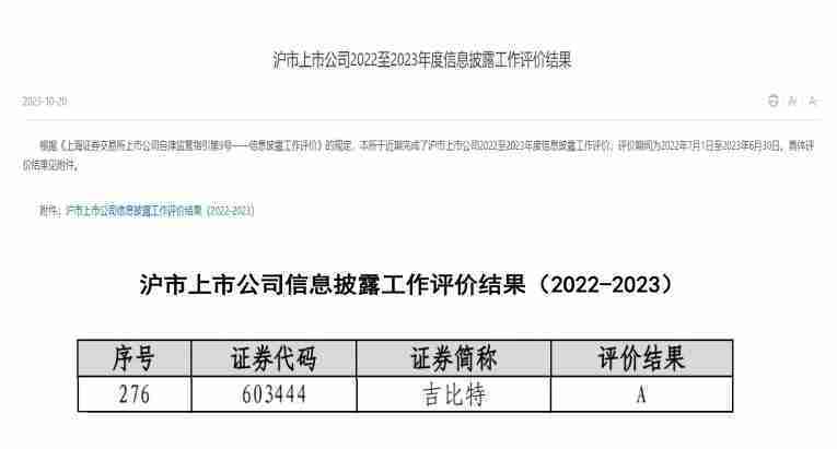 近日,,上海证券交易所发布2022-2023年度信息披露工作评价结果。。。。一竞技(股票代码:::603444)凭借规范的公司治理、、高质量的信息披露以及良好的投资者关系管理再次荣获信息披露工作A级评价,,,,公司连续两年获此殊荣。。。